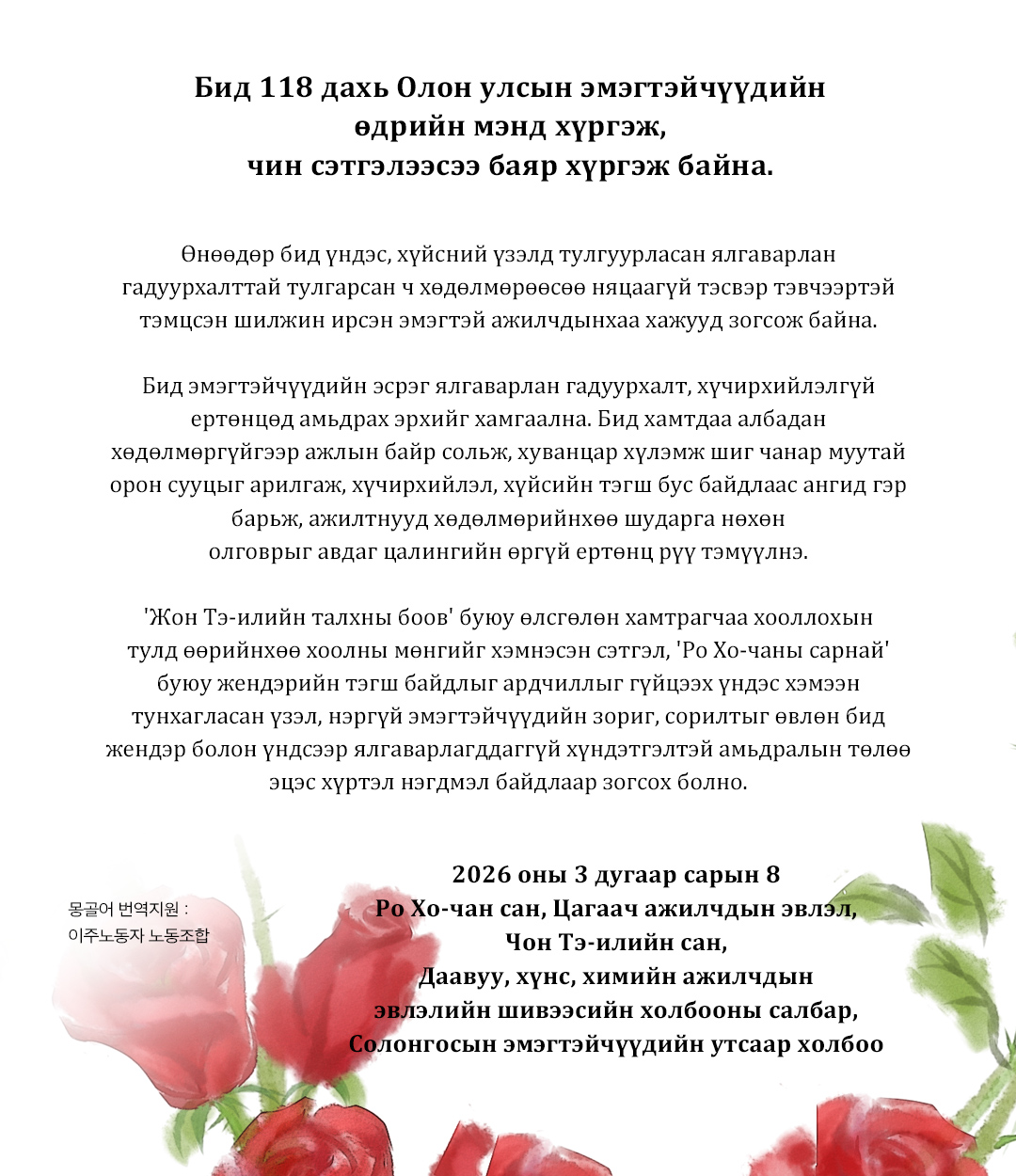 배고픈 동료를 위해 차비를 아껴 건넸던 ‘전태일의 풀빵’과 성평등이 민주주의의 완성이라 외쳤던 ‘노회찬의 장미’ 정신, 이름 없는 여성들의 용기와 도전을 이어받아, 성별이나 국적에 대한 차별 없이 존중받는 삶을 위해 끝까지 연대하겠습니다.
