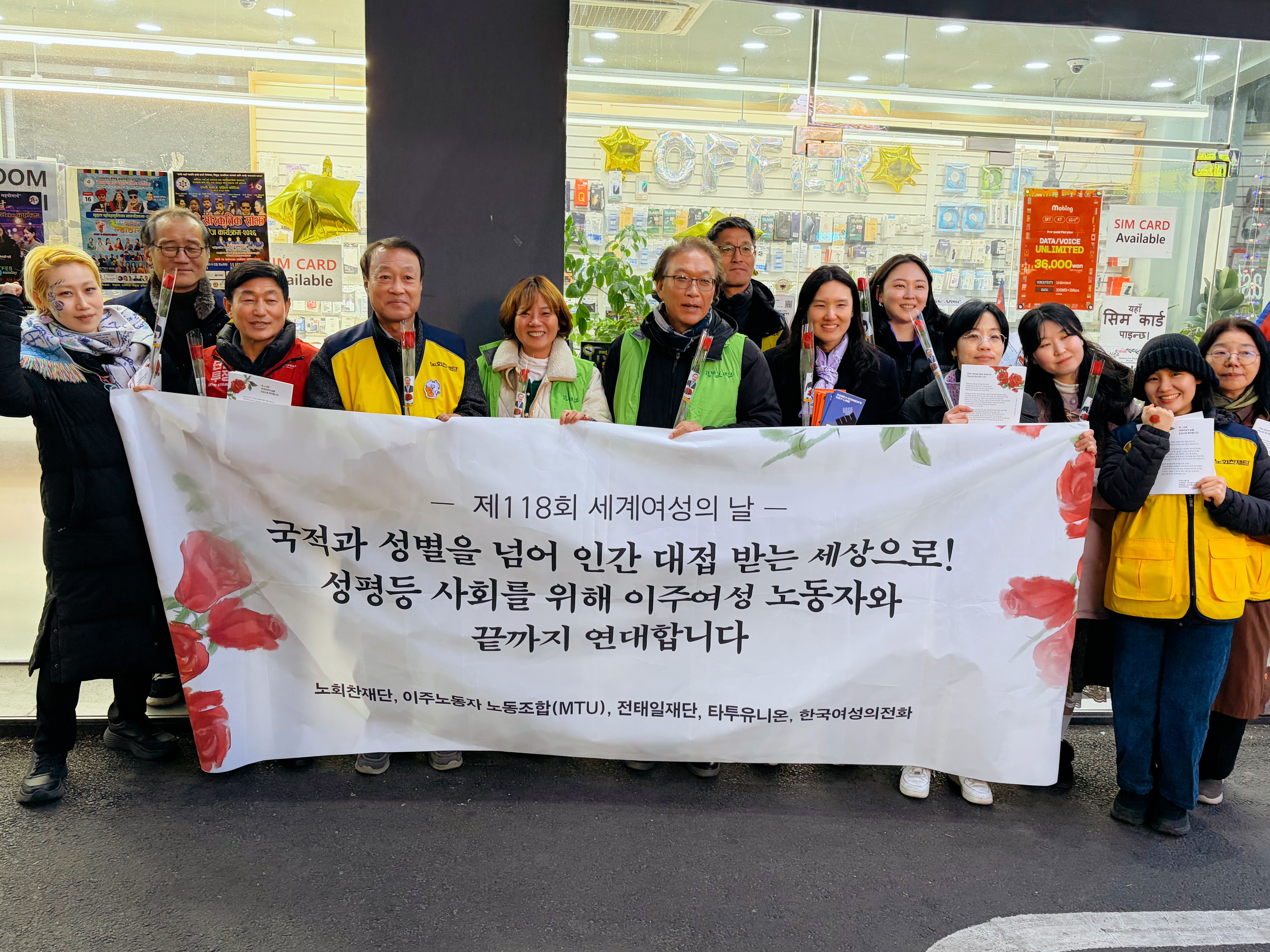 노회찬재단‧여성의전화‧이주노조‧전태일재단‧타투유니온은 <노회찬의집 6411>이 들어선 창신동 봉제 골목의 재봉틀 소리부터 이주 여성들의 땀방울까지, 노회찬장미와 전태일 풀빵으로 차별의 벽을 넘어 ‘동료 시민을 향한 사랑을 전했습니다. 그리고 이주노조와 함께 3.8 세계여성의날 기념하여 다국어 메시지 카드를 만들어 여성이주민들게 전달하였습니다.