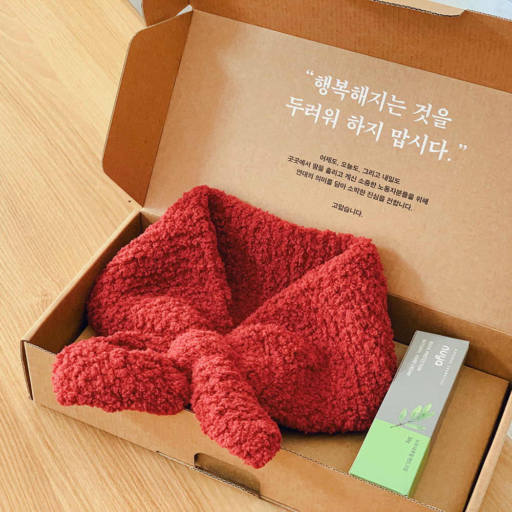 그리고 어르신들께 배움과 공정노동의 일자리 제공을 통해 직접 만들어진 '쁘띠목도리'와, 발달장애인 우수 채용기업에서 생산된 '핸드크림'이 담긴 <청소노동자편>.