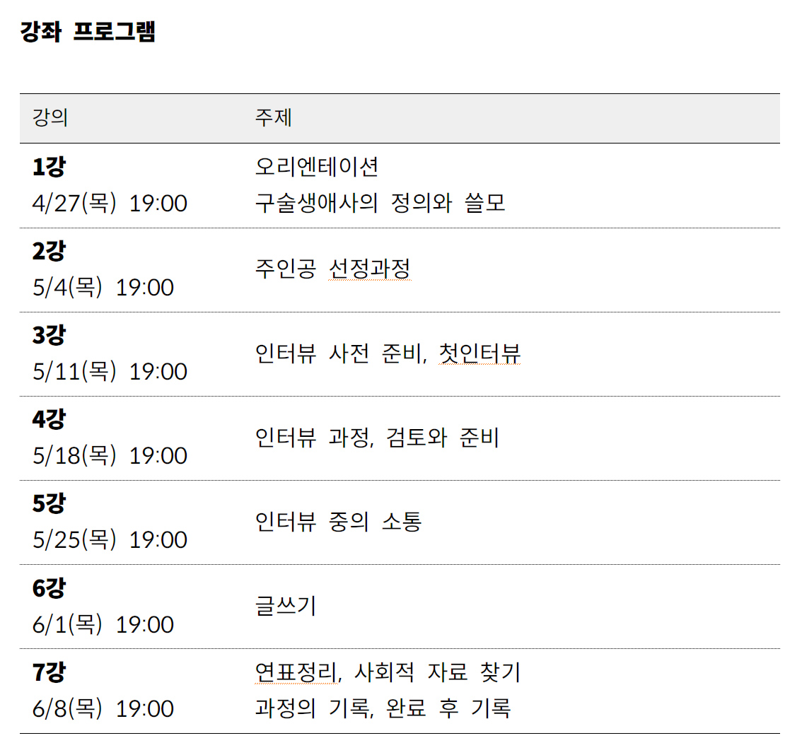 본 강좌에서는 주목받지 못하는 사람들의 말들을 기록하는 법을 배우게 됩니다. 구술자(화자)와 구술채록자(청자/필자)의 서로돌봄 및 서로치유의 과정이 될 것입니다.