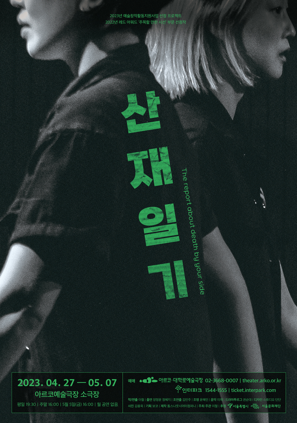 연극 <산재일기>는 노회찬의원 4주기 특별공연으로 기획되어 연일 매진을 기록했던 작품으로 2022년 레드어워드‘주목할 만한 시선’부문 선정작으로, 그리고 서울문화재단 예술창작활동지원사업 공모에 선정되어 대학로 아르코예술극장에서 정식으로 여러분을 만납니다.