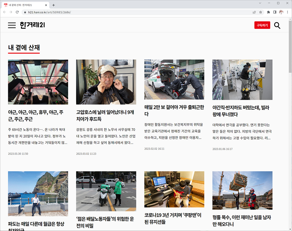 안녕하세요. 주간 잡지 “한겨레21”에 <내곁에산재>를 연재하고 있는 전수경입니다.
