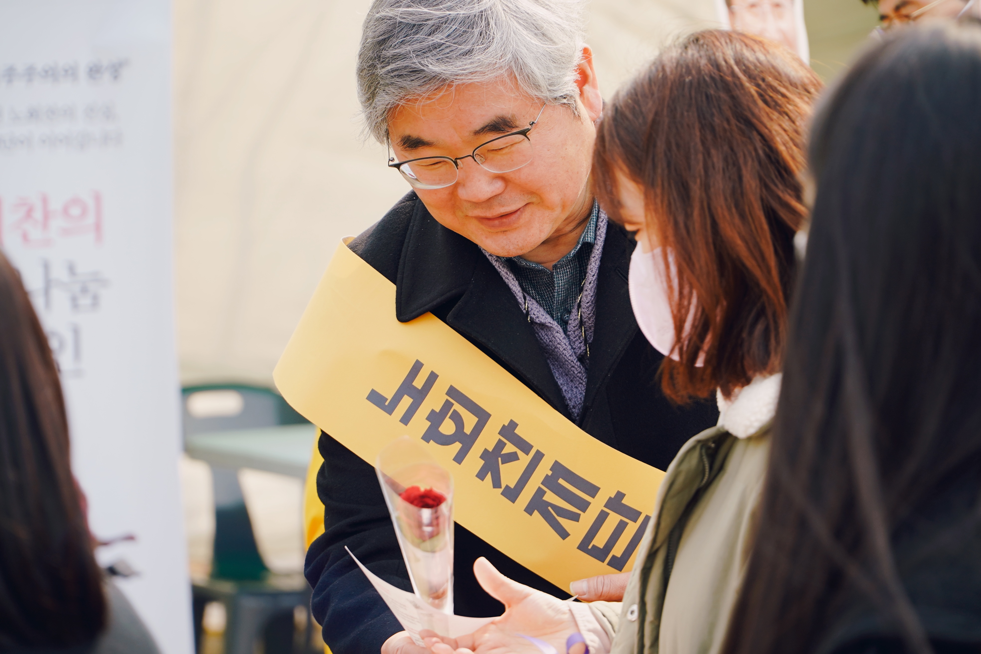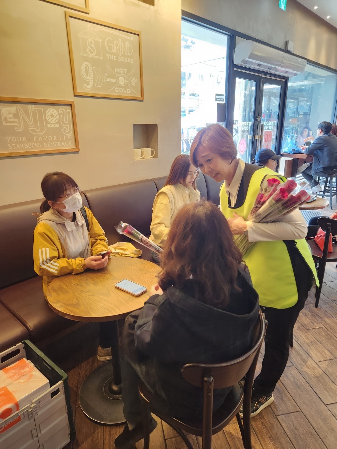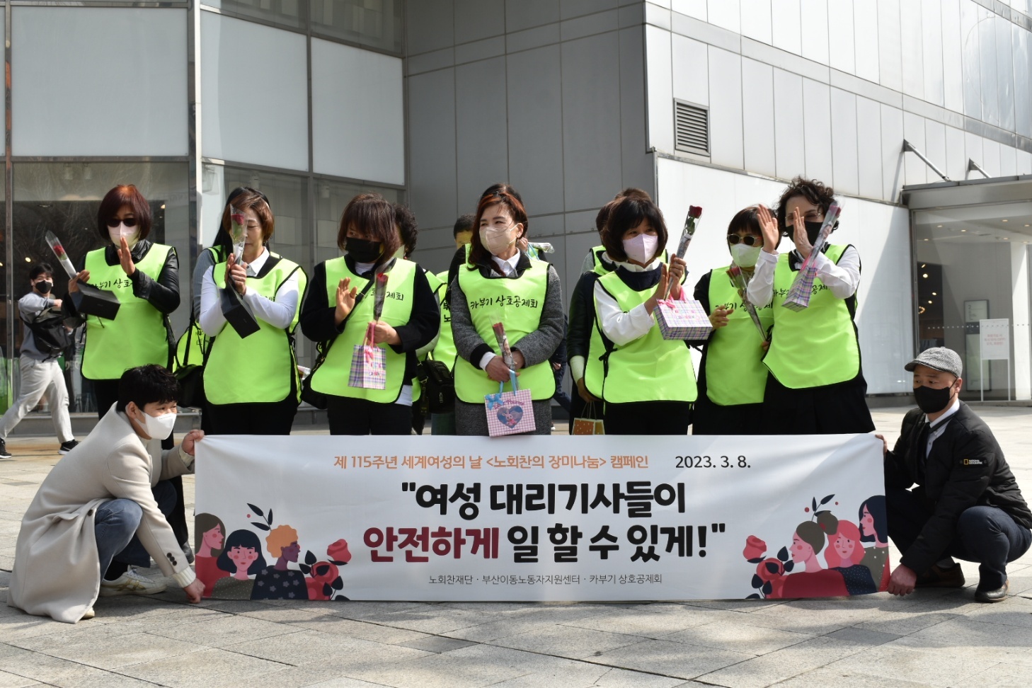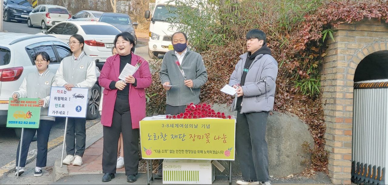 3월 8일(수) 오후 2시, 부산 서면 NC백화점 앞에서 여성대리기사들과 함께 ‘노회찬의 장미나눔 캠페인’을 진행했습니다. 이날 캠페인에서 노회찬재단은 카부기 상호공제회 소속 여성대리기사 20명에게 바디캠과 노회찬의 장미꽃을 선물하고, 여성대리기사와 함께 거리 캠페인을 진행했습니다. 이후 범냇골 보험사를 방문하여 비정규직 여성노동자들께 노회찬의 장미를 선물했습니다. 이번 캠페인은 노회찬재단, 부산이동노동자지원센터, 카부기상호공제회와 공동으로 진행했습니다.