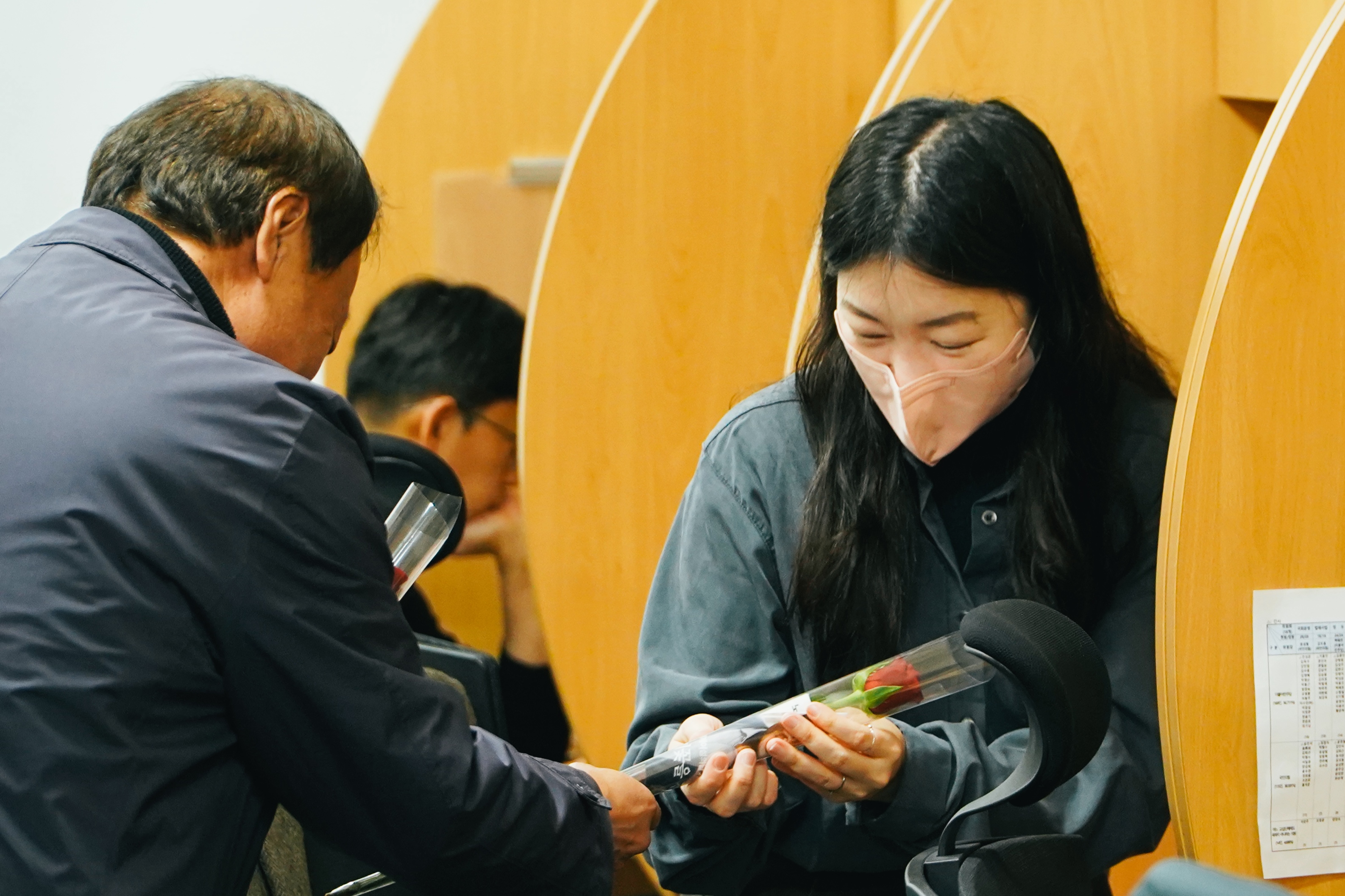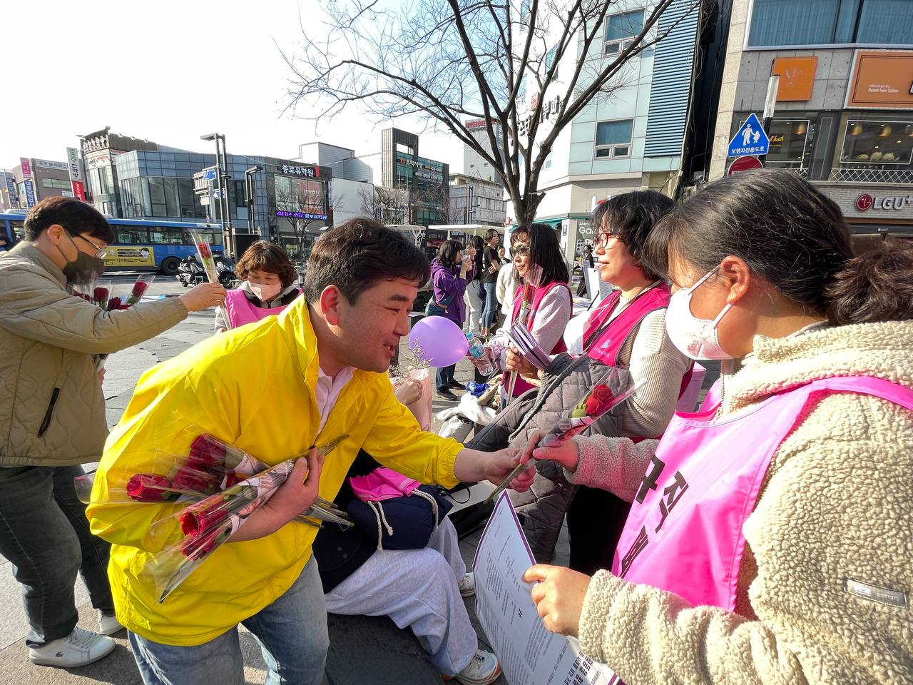경북 경산여성대회에서는 성평등인식 퀴즈에 참여한 분들게 장미꽃을 드렸고, 광주에서는 광주여상 특성화고 여성 청소년들에게 다음소희 없는 안전하고 성평등한 사회를 다짐하며 장미꽃 나눔을 진행했습니다. 대구에서는 여성대회에 참석해서 시민들께 장미를 나눴고, 부산에서는 신라대, 동의대, 부산대, 가톨릭대의 청소노동자, 생협노동자 등에게 장미를 드리면서 연대의 힘을 모았습니다.