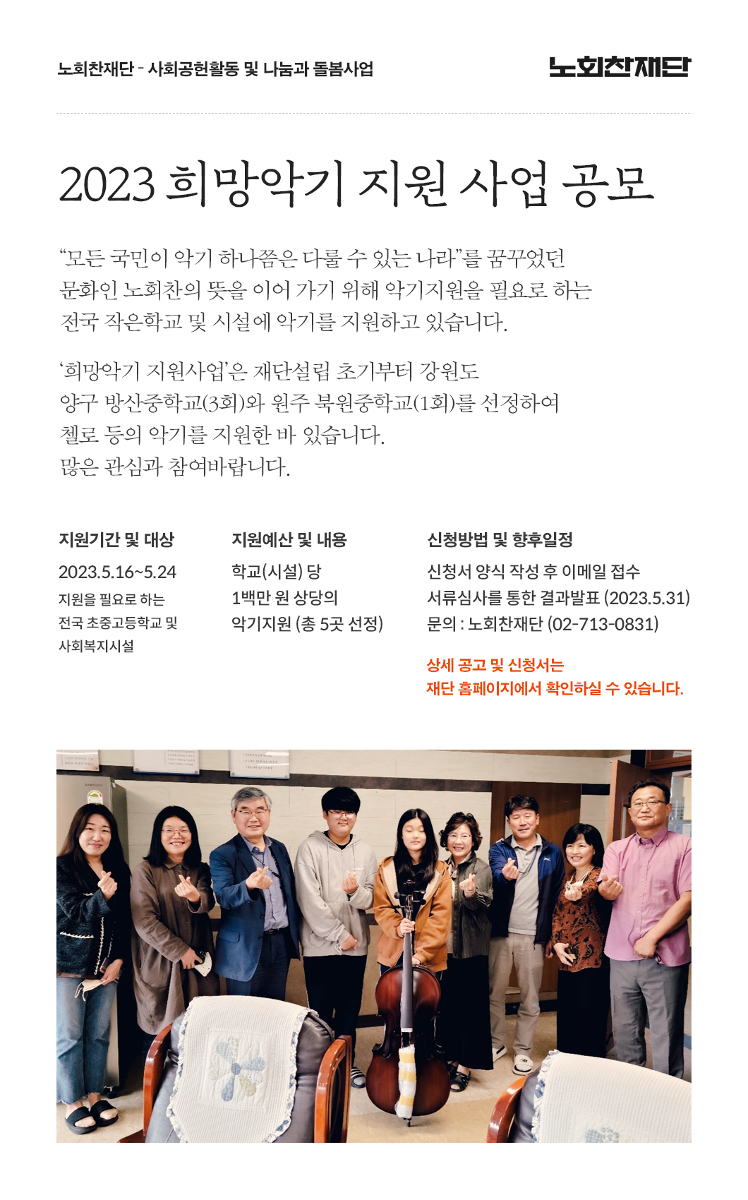 ‘희망악기 지원사업’은 재단설립 초기부터 강원도 양구 방산중학교(3회)와 원주 북원중학교(1회)를 선정하여 첼로 등의 악기를 지원한 바 있습니다. 많은 관심과 참여바랍니다.