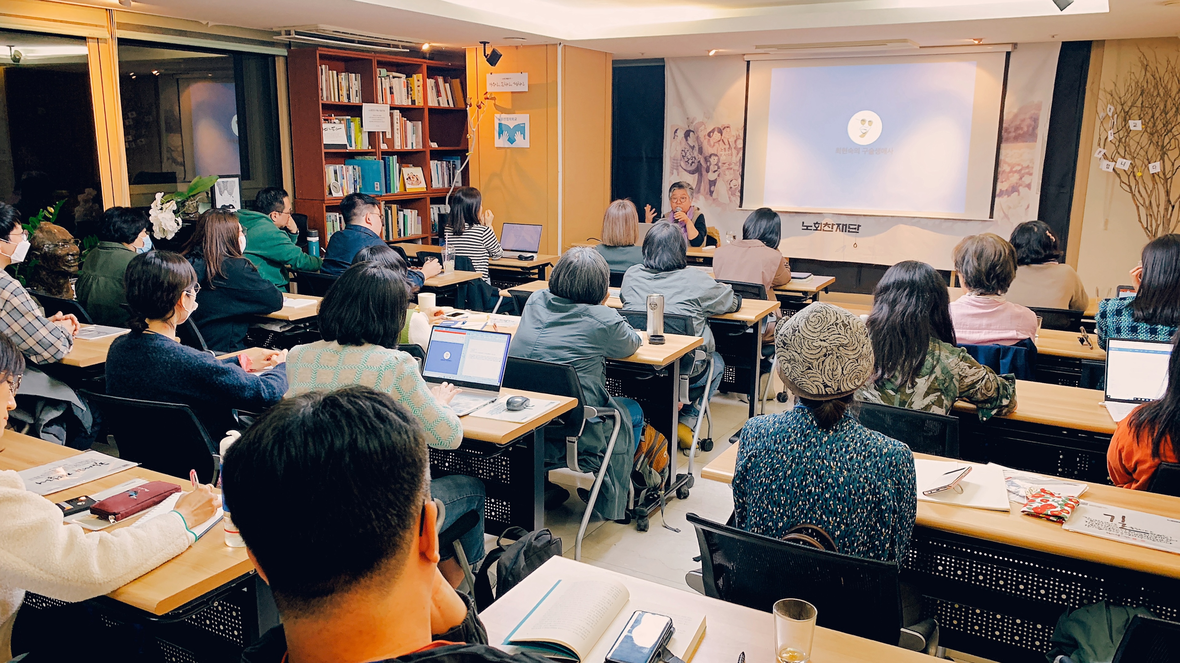지난 4월 27일부터 시작된 서로돌봄과 서로치유의 과정‘최현숙의 구술생애사’는 주1회 7주간 진행되는 연속 강좌입니다. 이 강좌는 노회찬재단의 <실천하는 인문예술교실>의 첫문을 연 사업으로 공식 홍보전부터 대기자를 받을 정도로 구술사작업에 대한 높은 관심과 최현숙 선생님의 매니아층이 이미 두텁게 형성되어 있었습니다.