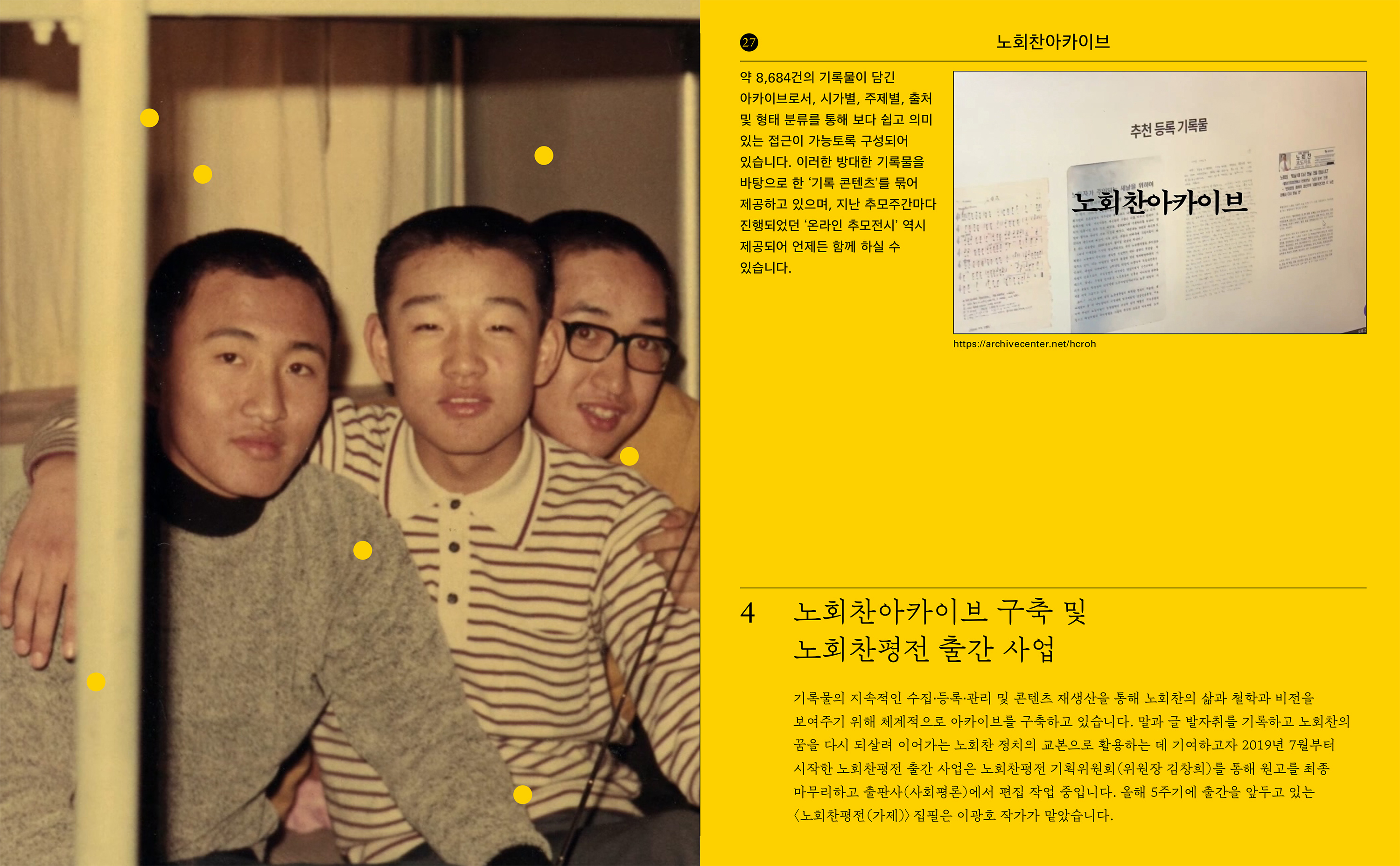 재단의 다양한 활동에 비해, 그 내용들을 체계적으로 정리하고 알려드리지 못해 그동안 송구한 마음이었습니다. 재단에서는 추모를 넘어 재단에 대한 깊은 관심을 보여주시는 분들이 늘어가는 만큼, 이에 대한 준비가 꼭 필요하다고 판단하였고, 이번 연례보고서가 재단이 전해드리는 첫 번째 응답이 되기를 바랍니다.