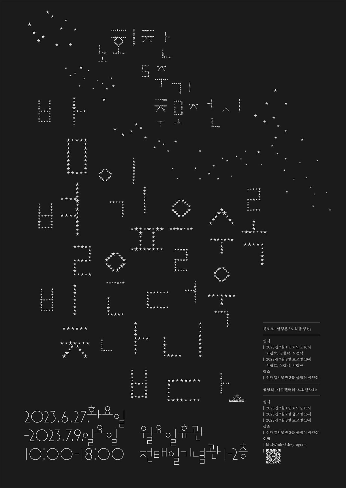 전시회와 함께 『노회찬 평전』 북토크, 다큐멘터리 〈노회찬6411〉 특별 상영회 또한 준비하였습니다. 이번 5주기 추모 전시와 행사를 통해 어려운 시기 노회찬의 꿈을 되새기고, 힘을 모아나갈 소중한 시간이 되기를 바랍니다.