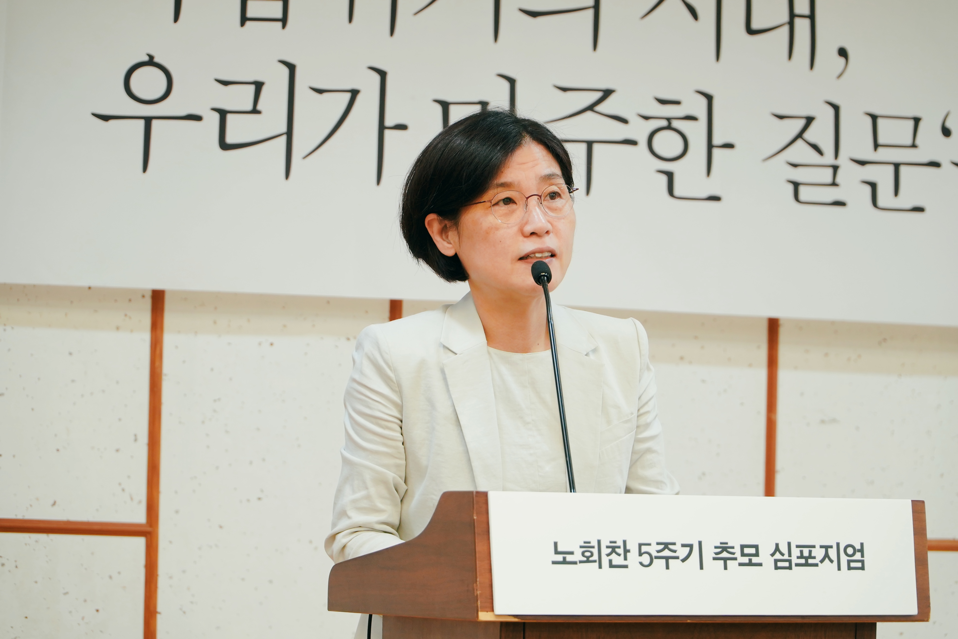 이번 5주기 심포지엄은 기후위기, 디지털 전환, 불평등 심화 등 복합위기의 시대에 우리가 마주한 ‘질문’들을 나누고 우리의 현재를 진단하는데 초점을 두었습니다. 첫 번째 기조연설에서 서복경 대표는 인류의 미래가 그 어느 때보다 불확실한 시간이지만 과거를 향한 집권자들의 질주는 점점 더 가속도가 붙은 “전대미문의 시대”에 때를 놓치지 않고 선택을 하는, 그러면서도 노회찬처럼 인간에 대한 배려를 잊지않는 “우리에게 필요한 용기”를 말했습니다. 두 번째 기조연설자인 김진석 교수가 “한국 복지국가가 당면한 세 개의 질문”에서 밝힌 △ 다양화하는 비정형 노동, △ 줄어드는 가족과 가족 기능, △ 지속불가능한 성장은 이번 심포지엄에서 우리가 마주하고자 했던 질문이기도 합니다.