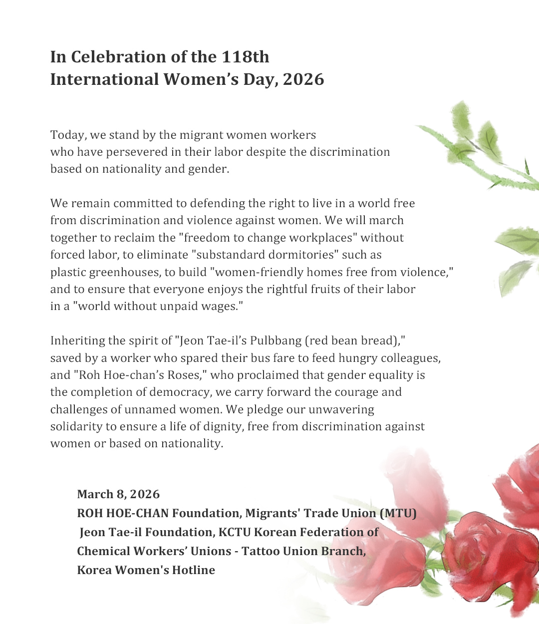 배고픈 동료를 위해 차비를 아껴 건넸던 ‘전태일의 풀빵’과 성평등이 민주주의의 완성이라 외쳤던 ‘노회찬의 장미’ 정신, 이름 없는 여성들의 용기와 도전을 이어받아, 성별이나 국적에 대한 차별 없이 존중받는 삶을 위해 끝까지 연대하겠습니다.
