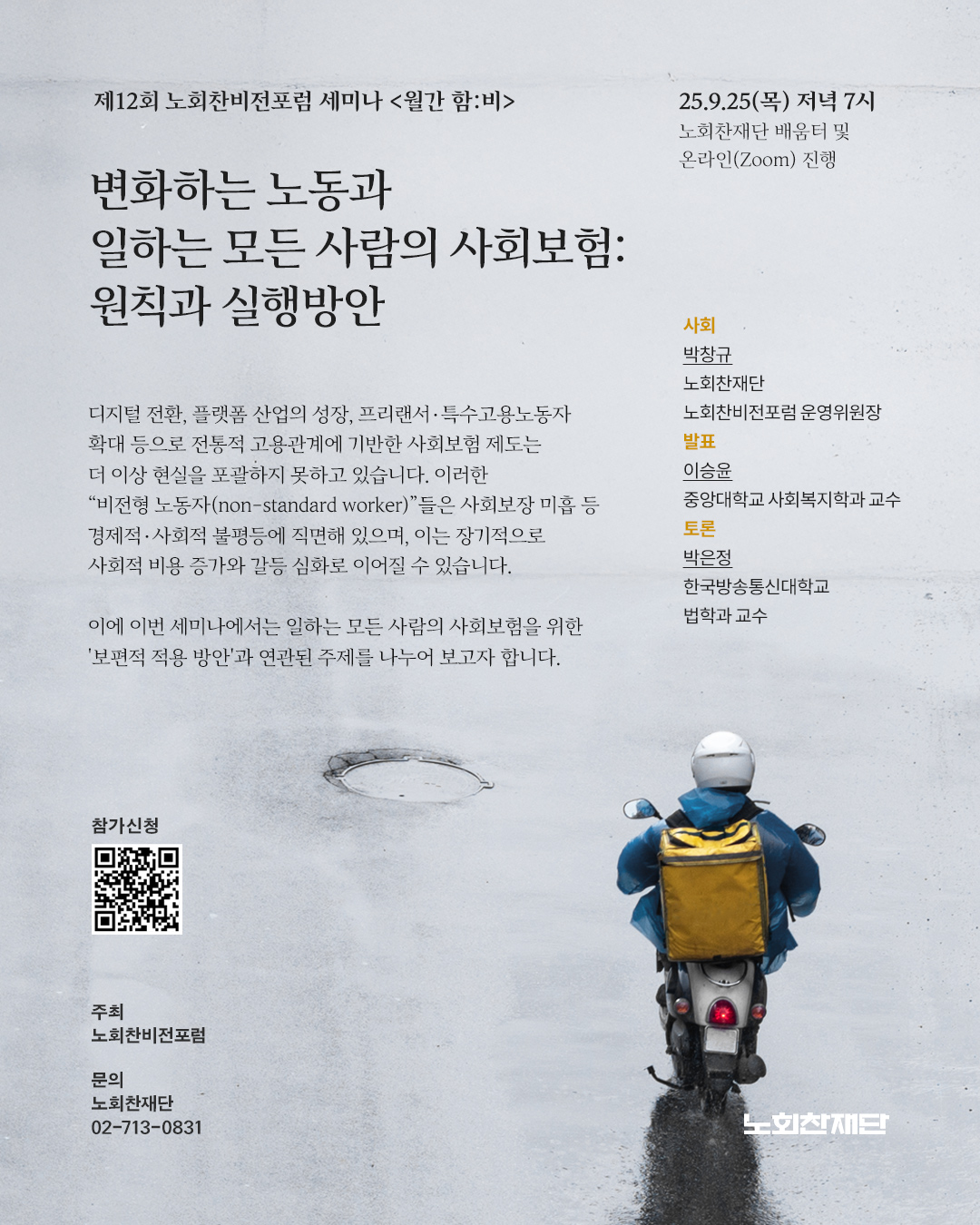 노회찬재단은 이와 같은 비전형 노동자들의 노동권 보호와 권리 확대 보장을 공론화하기 위해 지난 25일 '변화하는 노동과 일하는 모든 사람의 사회보험: 원칙과 실행방안'을 주제로 제12회 함께맞는비 포럼을 개최했다.