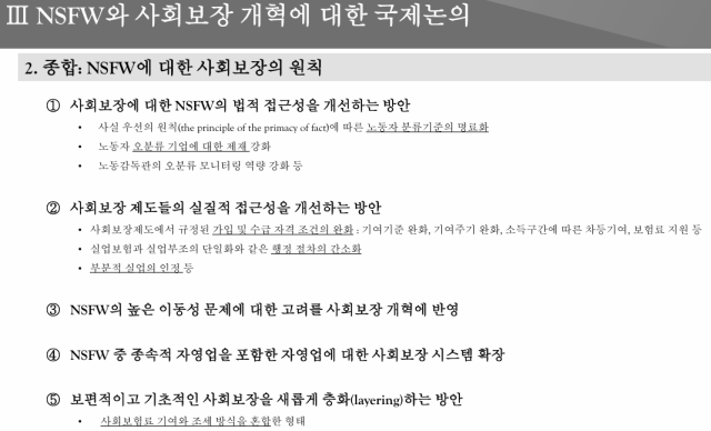 또 '실질적 접근성 개혁 전략'에 대해서는 "사회보험의 필수적인 가입 요건을 사용자-근로자 관계 확인에서 소득으로 전환하는 소득보험 전략이 있을 수 있는데 이것은 최소 소득 수준을 정하는 과제가 남아 있고, 소득 수준이 낮은 액화노동자들에게 불충분한 사회보장을 제공하는 문제가 있다"고 설명했다.